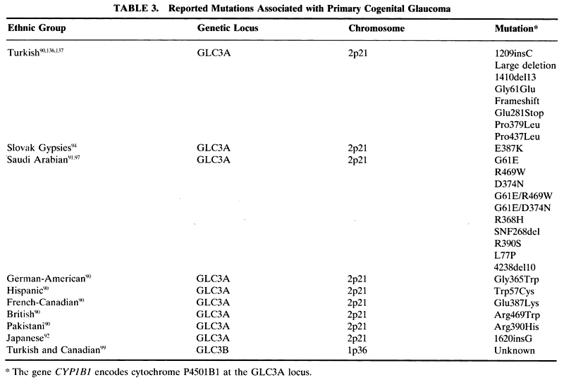 CONGENITAL GLAUCOMA Congenital glaucoma is defined as glaucoma present at birth. In reality, most cases of this type of glaucoma are probably better-termed infantile glaucoma because the disease is often not manifest until several months of age up to 3 years old. From a clinical standpoint, infantile glaucoma is most often an autosomal recessive disease characterized by increased IOP caused by an angle dysgenesis that leads to the classic symptom triad of corneal clouding attributable to edema, epiphora, and photophobia. If left untreated, buphthalmos and amblyopia often develop. This form of glaucoma must be considered separately from secondary congenital glaucomas in which the glaucoma likely arises as a result of other dysmorphic or multisystem abnormal conditions. Two loci have been identified that appear to segregate with infantile glaucoma, termed GLC3A and GLC3B. These loci have been localized to chromosome 2 and 1, respectively (Table 3). The gene that is mutated at the GLC3A locus is cytochrome P4501B1. Multiple mutations in this gene havebeen identified in populations around the world, in-cluding German-American, Hispanic, French-Canadian, British, Pakistani, Turkish,90 Saudi Arabian,91 Japanese,92 and Slovak Gypsies.93 In Slovak Gypsies affected with congenital glaucoma, the mutation has been reported to be a homozygous glutamic acid substitution for lysine at position 387.94 This location happens to be in a highly conserved portion of the protein and the various mutations most likely affect the normal protein folding or truncate the protein. Position 387 is absolutely conserved among cytochrome P450 proteins and so is likely a critical portion of the protein. A homozygous mutation of glutamic acid for lysine at this position is always associated with congenital glaucoma.94 This matches well with the original descriptions of congenital glaucoma being markedly worse in the Slovak Gypsy population than in other groups.95,96 This is not the case in other families with different mutations. Such families can have incomplete penetrance and a variable clinical picture depending on the mutation and whether it is heterozygous or homozygous.90,97