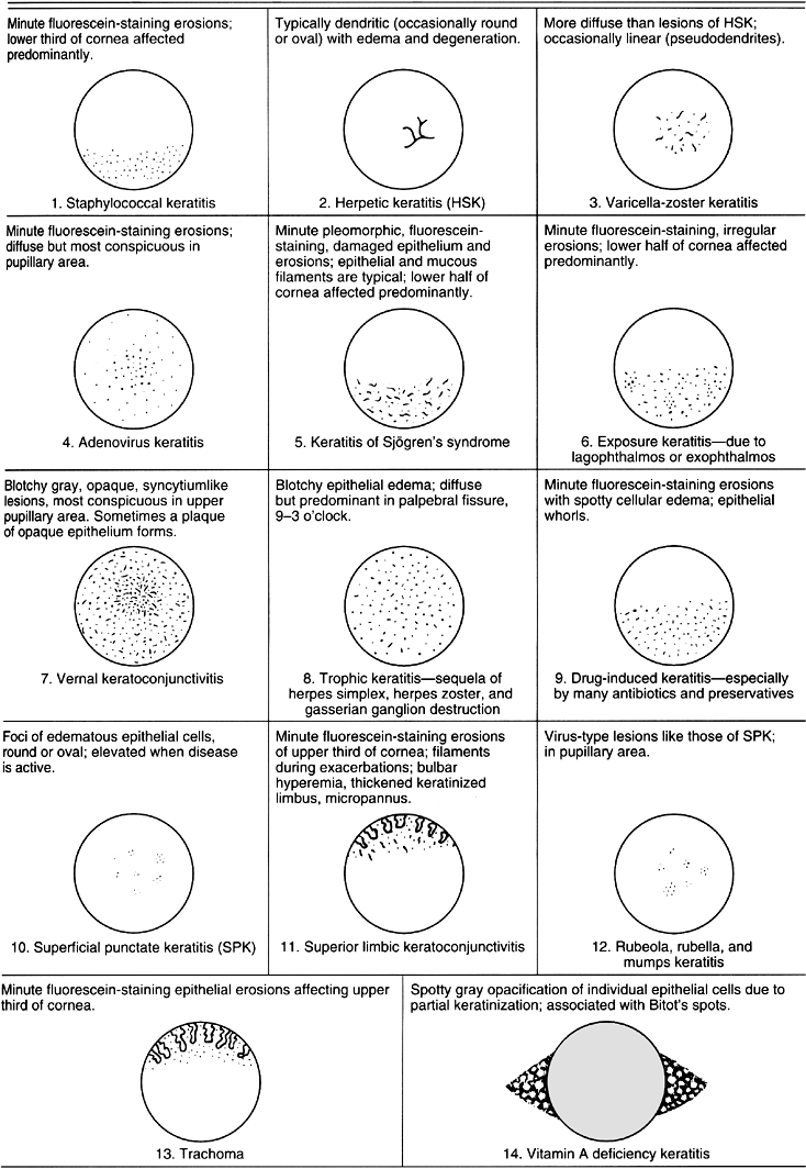 The corneal epithelium is involved in most types of conjunctivitis and keratitis and in rare cases may be the only tissue involved (eg, in superficial punctate keratitis). The epithelial changes vary widely from simple edema and vacuolation to minute erosions, filament formation, partial keratinization, etc. The lesions vary also in their location on the cornea. All of these variations have important diagnostic significance (Table 6-1), and biomicroscopic examination with and without fluorescein staining should be a part of every external eye examination.