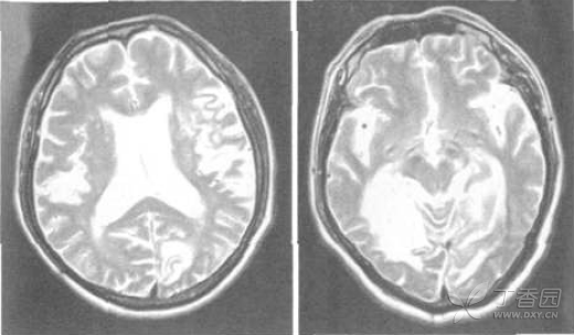 体检:意识清楚,反应稍迟钝,双瞳孔等大等圆,直径3 mm,对光反应存在,眼球活动正常,双侧视力正常,不能分辨红绿蓝等颜色,右侧鼻唇沟浅,伸舌偏右,无抵抗,右侧肢体肌力Ⅴ-级,左侧肢体肌力Ⅴ级,四肢肌张力、腱反射正常,双侧Babinski征(-),共济正常,深浅感觉正常,无失语、失用、失认。
